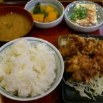 名古屋市伏見宴酒場 ちゃきちゃき。居酒屋ランチです。メインのオカズ1品に小鉢2品、味噌汁ついてライスお代わり無料。と、まさにサラリーマンの味...